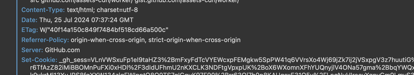 - 이 예시에서는 _gh_sess 쿠키가 포함(쿠키는 클라이언트와 서버 간의 상태 정보를 유지하는 데 사용)