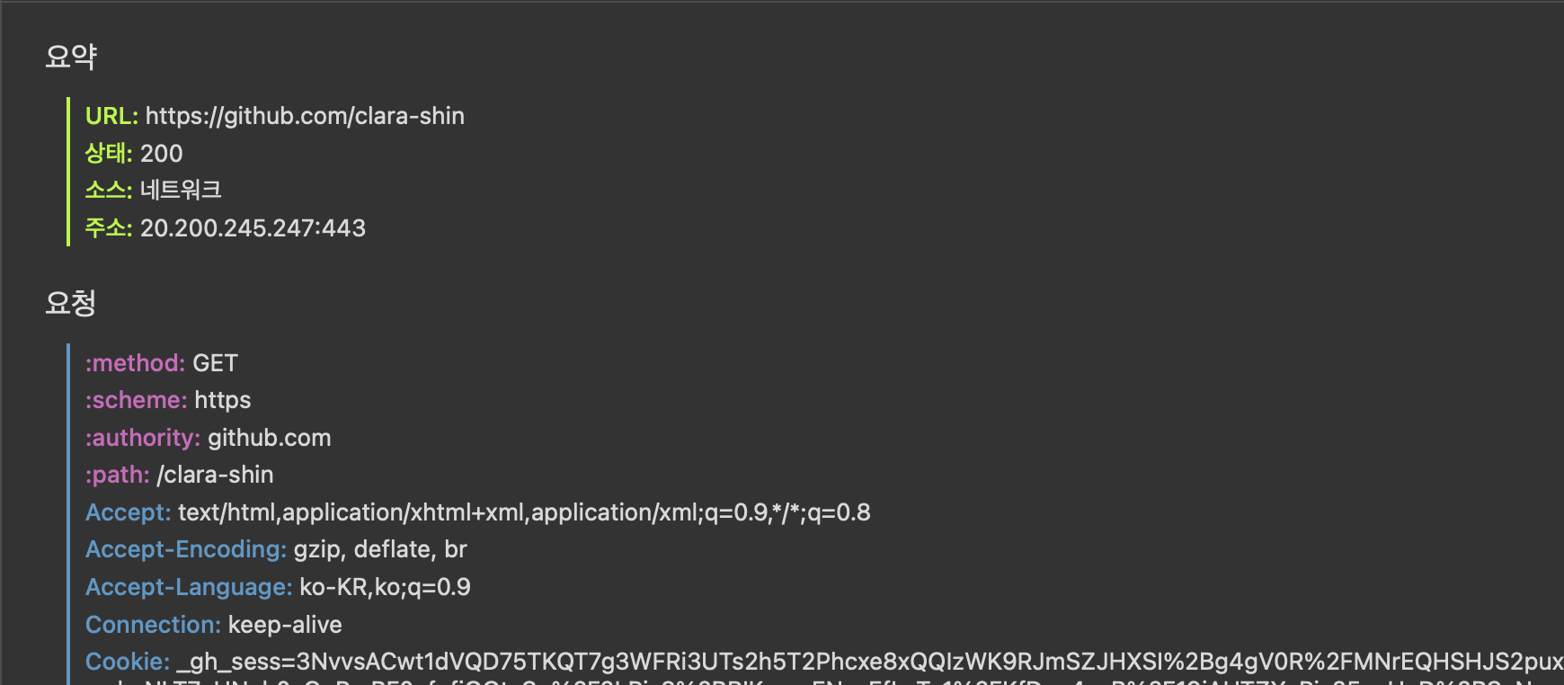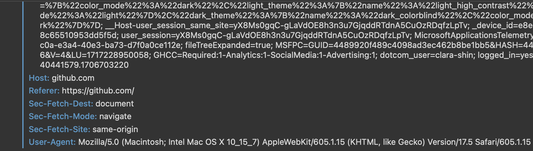 - 이 예시에서는 _gh_sess 쿠키가 포함(쿠키는 클라이언트와 서버 간의 상태 정보를 유지하는 데 사용)