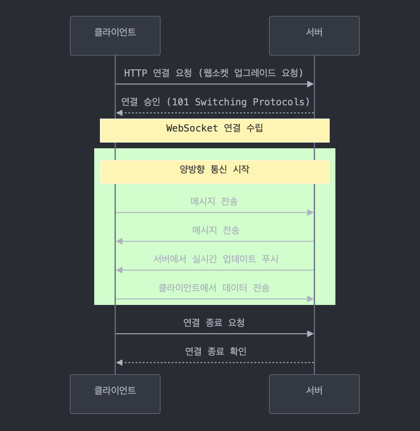 - WebSocket 연결이 수립되면, 클라이언트와 서버 간에 자유로운 양방향 통신이 가능
