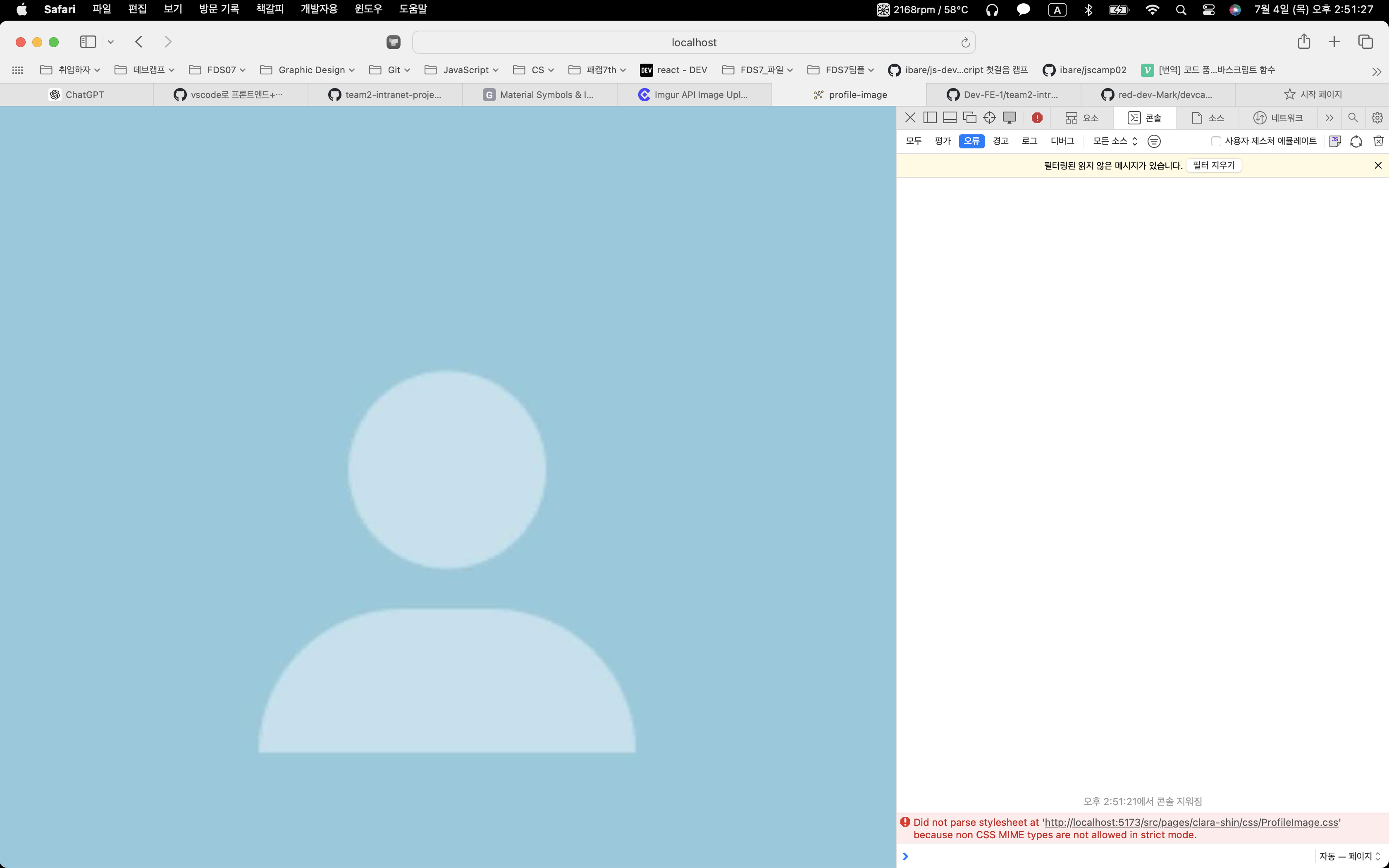 그런데 새로고침을 하고보니, 프로필이미지를 붙인 페이지의 css가 깨져버림