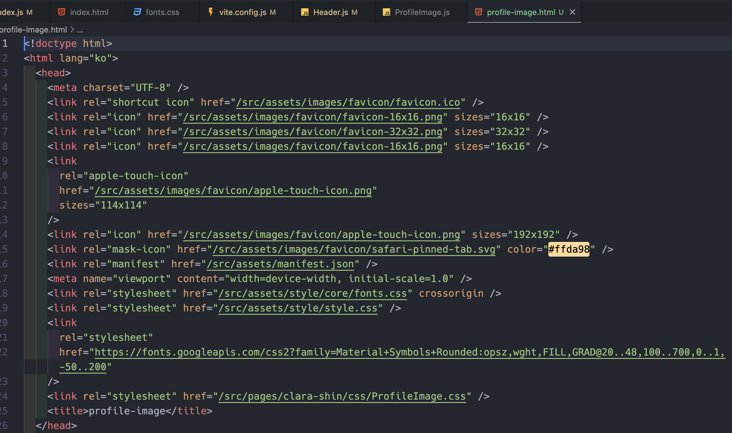- 폴더구조 보면 index.html과 동일한 depth에 profile-image.html이 있고 여길 들여다보면 <link rel="stylesheet" href="/src/pages/clara-shin/css/ProfileImage.css" /> 를 볼 수 있다